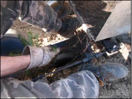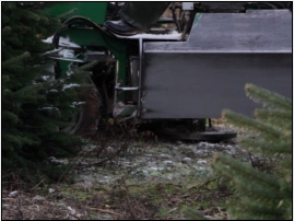 Im 4. Standjahr werden die nun etwa 1,0 m bis 1,4 m großen Bäume "Stumpfbeschnitten", d.h. mit einer kleinen quer-rotierenden Fräse
